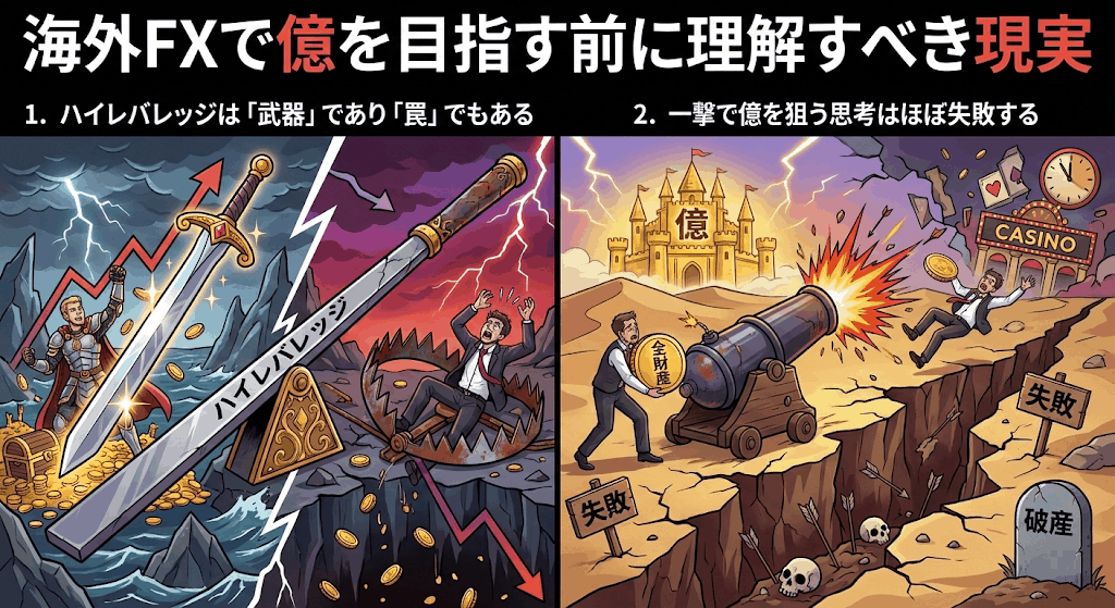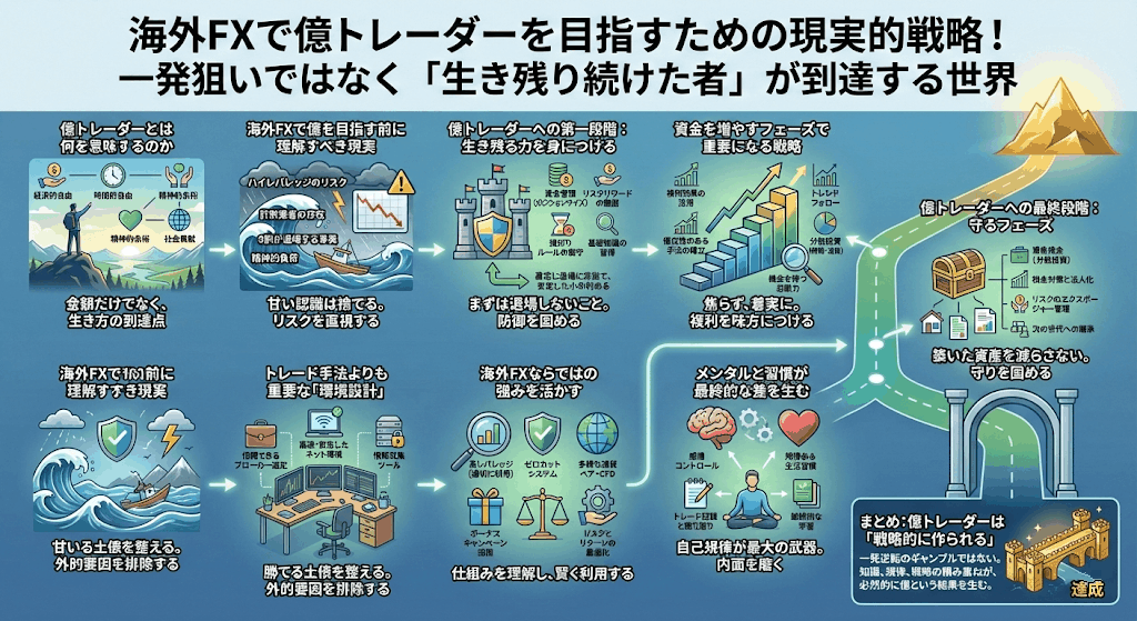 本記事では、海外FXという環境を正しく理解したうえで、億トレーダーを目指すために必要な考え方、資金戦略、トレード戦略、リスク管理、そしてメンタルの作り方までを、現実的かつ実務的な視点で詳しく解説します。