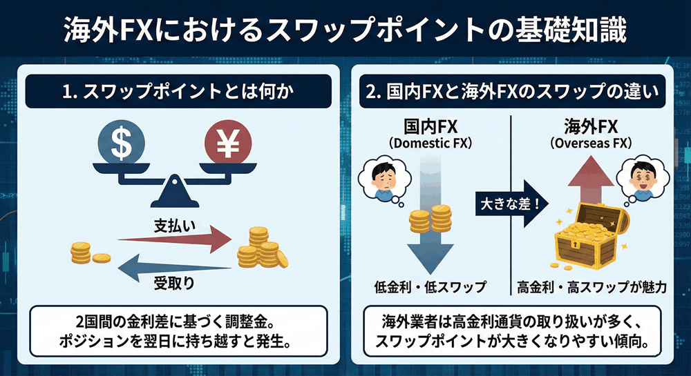 特に国内FXと比較すると、海外FXではスワップ条件が業者ごとに大きく異なり、その差を利用したスワップポイントのサヤ取り戦略が成立しやすい環境にあります。