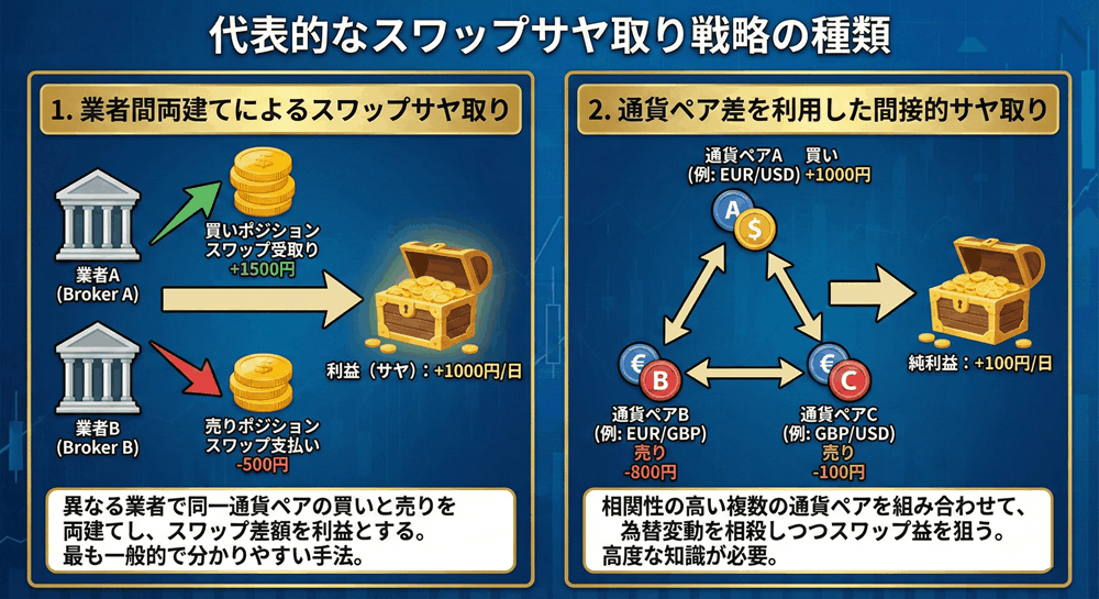 スワップポイントのサヤ取りとは、為替差益を狙う通常のトレードとは異なり、「金利差・スワップ条件の違い」から生じる不均衡を収益源とする戦略です。
