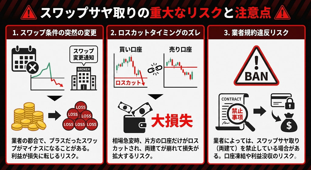 相場予測に依存せず、時間を味方につける点は大きな魅力ですが、その一方で、規約・スワップ改定・証拠金管理といった見えにくいリスクも多く存在します。
