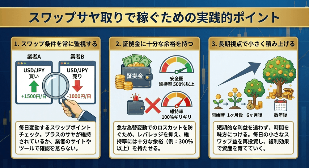 スワップサヤ取りを成功させるには、常に条件を検証し、撤退基準を明確にし、冷静に運用する姿勢が不可欠です。