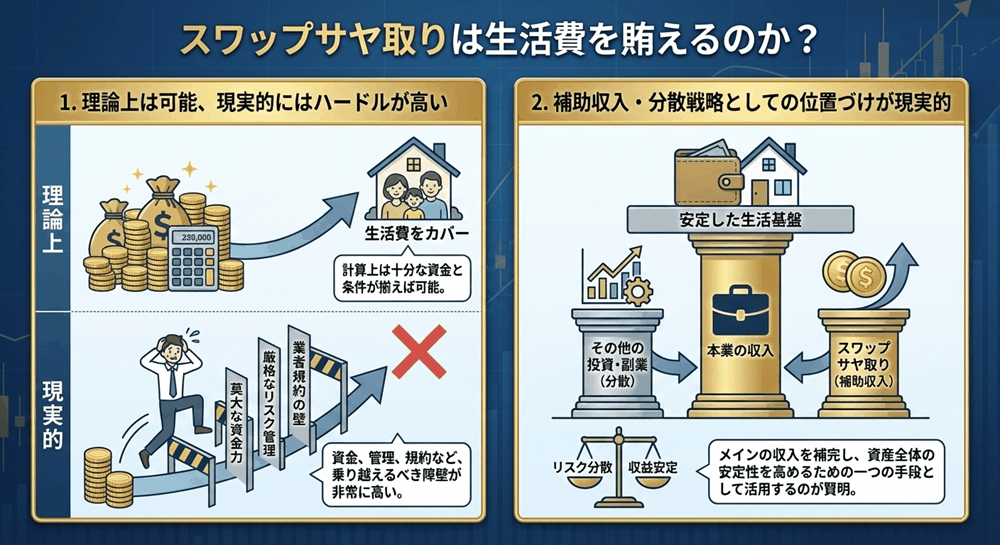 理論上、十分な資金と大きなポジションを持てば、スワップ収入だけで生活費を賄うことは可能です。