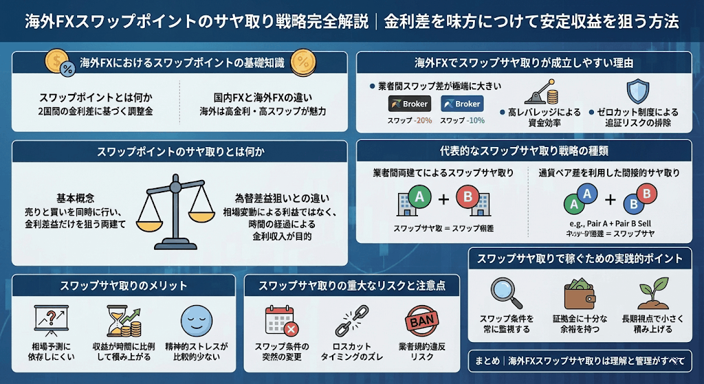 特に国内FXと比較すると、海外FXではスワップ条件が業者ごとに大きく異なり、その差を利用したスワップポイントのサヤ取り戦略が成立しやすい環境にあります。